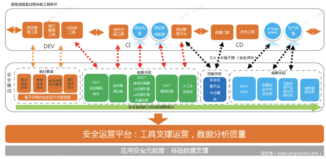 这里需要建设一系列检查手段,包括SDLC执行规范质量检查、基于流量的DAST、基于堆栈的IAST、基于代码的SAST、基于包库的组件及依赖检查、人工安全测试的五种检查手段。