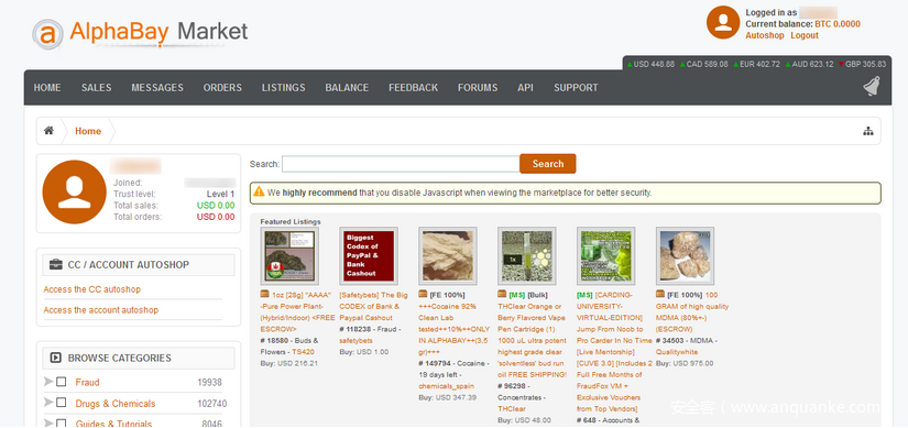 美国司法部表示,在AlphaBay上,买方和卖方已经进行过数十万次枪支、毒品、被盗身份信息、信用卡号和其他非法物品的交易。