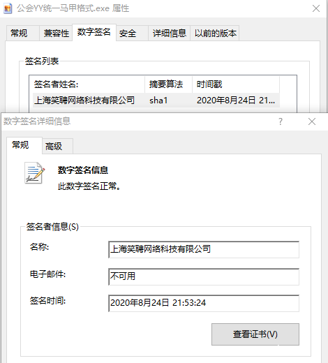值得注意的是,360安全大脑对其行为进行了深度分析,发现该恶意软件为了躲避安全软件查杀,给自身打上了合法的数字签名。