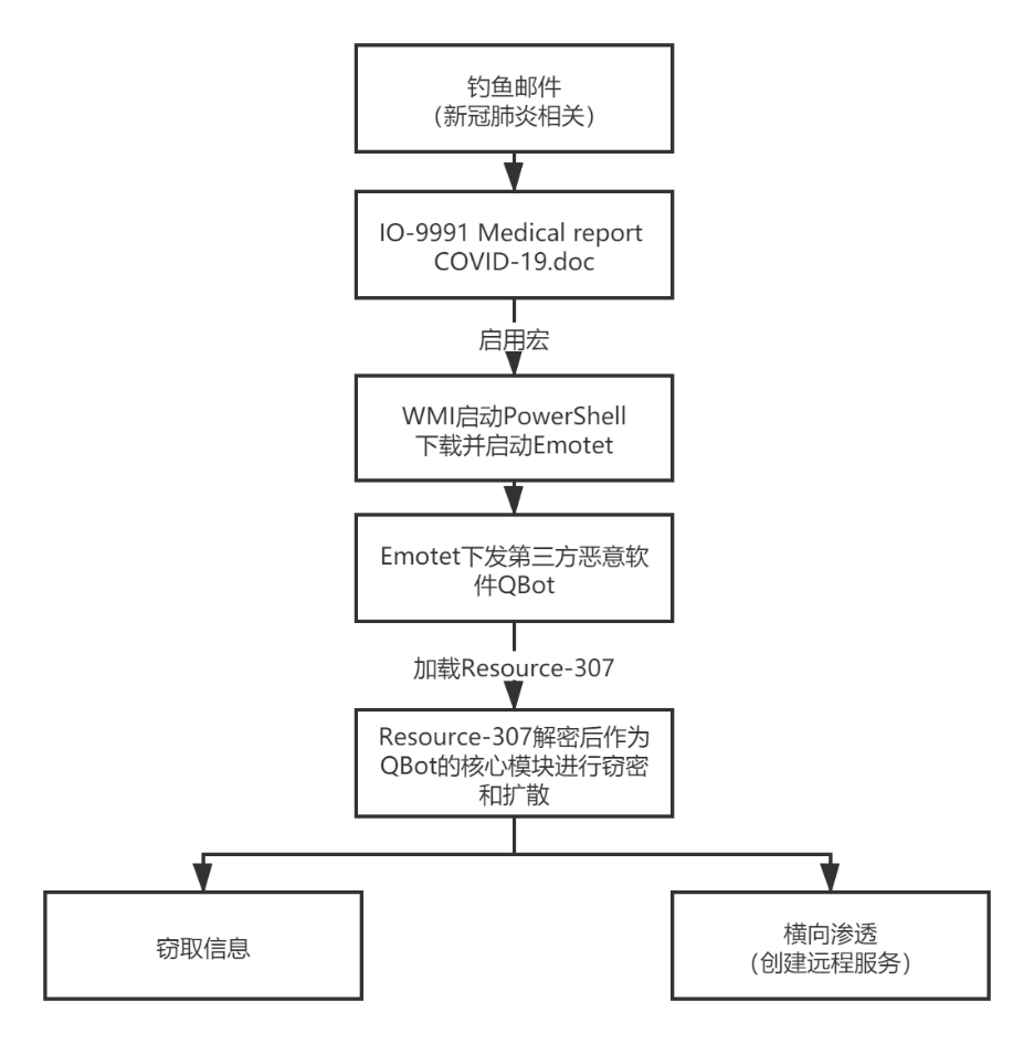 对该木马进行溯源并深入分析后,360安全大脑发现该木马作者正在利用以“新型冠状病毒”疫情为话题的钓鱼邮件进行传播,当木马程序被启动后,最新的Emotet变种通过下发Qbot进行横向渗透。
