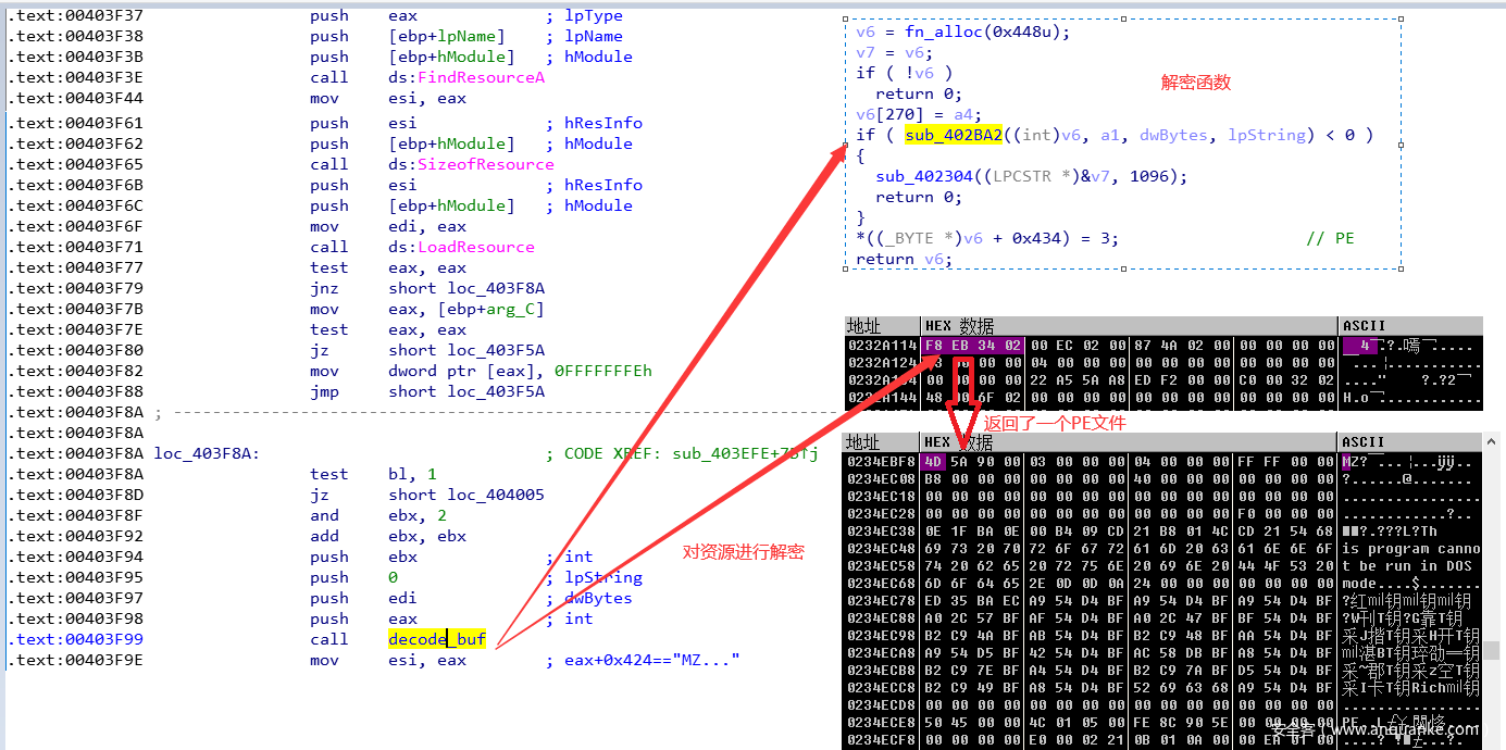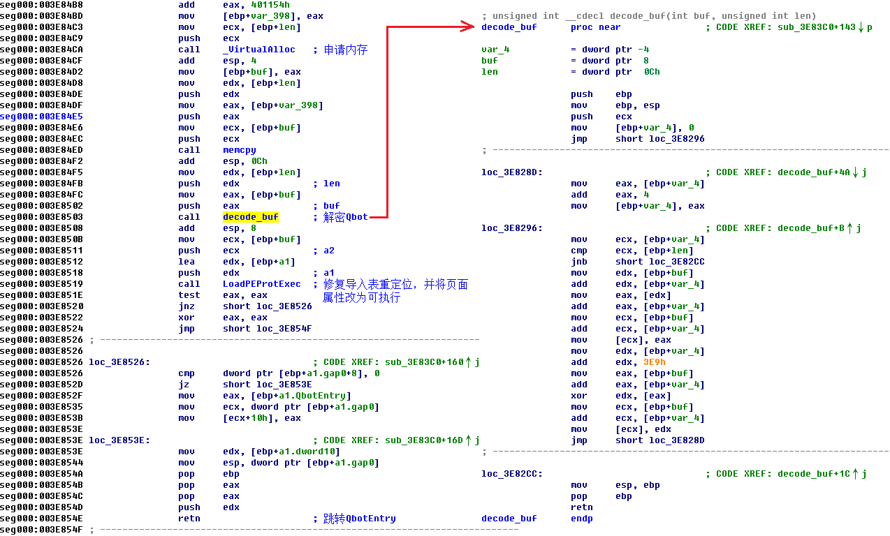 此次Emotet木马主要下发QBot木马去窃取信息并进行横向渗透,QBot使用了多种代码混淆技术隐藏真正的病毒母体,其解密并加载被混淆的恶意载荷相关代码逻辑如下: