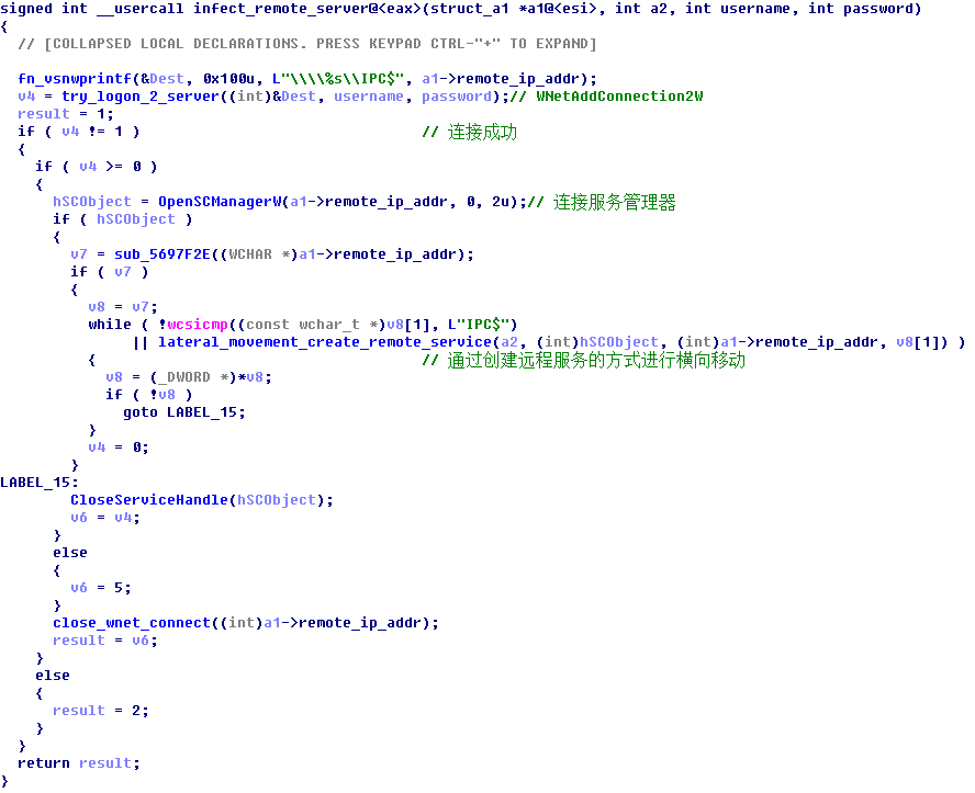 Qbot通过枚举域控服务器上的用户账户,得到一个用户名列表,配合弱口令字典对当前计算机连接的远程机器进行爆破,如果连接成功则调用OpenSCManagerW与远程计算机的服务控制管理器建立连接,并通过创建远程服务的方式横向移动到远程机器。