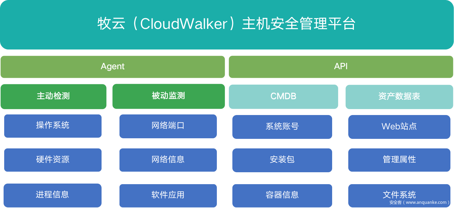 牧云(CloudWalker)主机安全管理平台通过轻量级主机Agent,持续收集主机中的资产数据,综合运用指纹识别、持续监测、CMDB、资产表、手工录入等技术满足多种场景下资产发现的全面性要求。