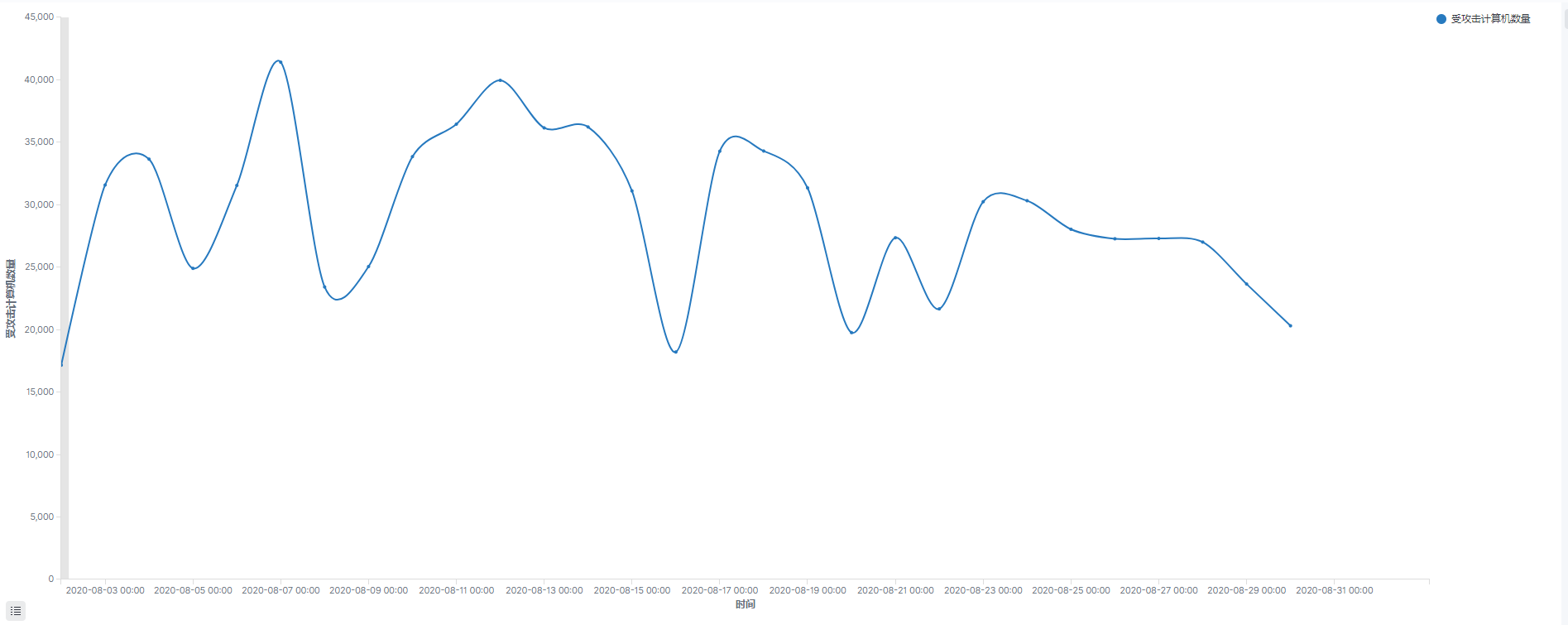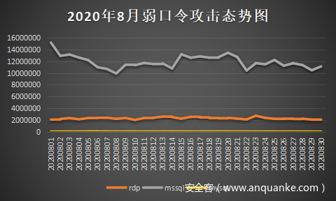 另外,在8月出现的弱口令攻击中,RDP和MySQL弱口令攻击的整体态势无较大波动,但MSSQL弱口令攻击却出现一次上涨趋势。