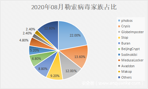 在360安全大脑发布的《2020年8月勒索病毒疫情分析》中,除了phobos、Crysis、GlobeImposter三大勒索病毒家族合力砍下47.60%的总占比,依次分居榜单前三外,本月新出现的勒索病毒家族,均未存在大规模传播态势。即便上个月新出现的BeijingCrypt勒索病毒在本月占比依旧位居第六,但在本月的传播也呈现疲态。