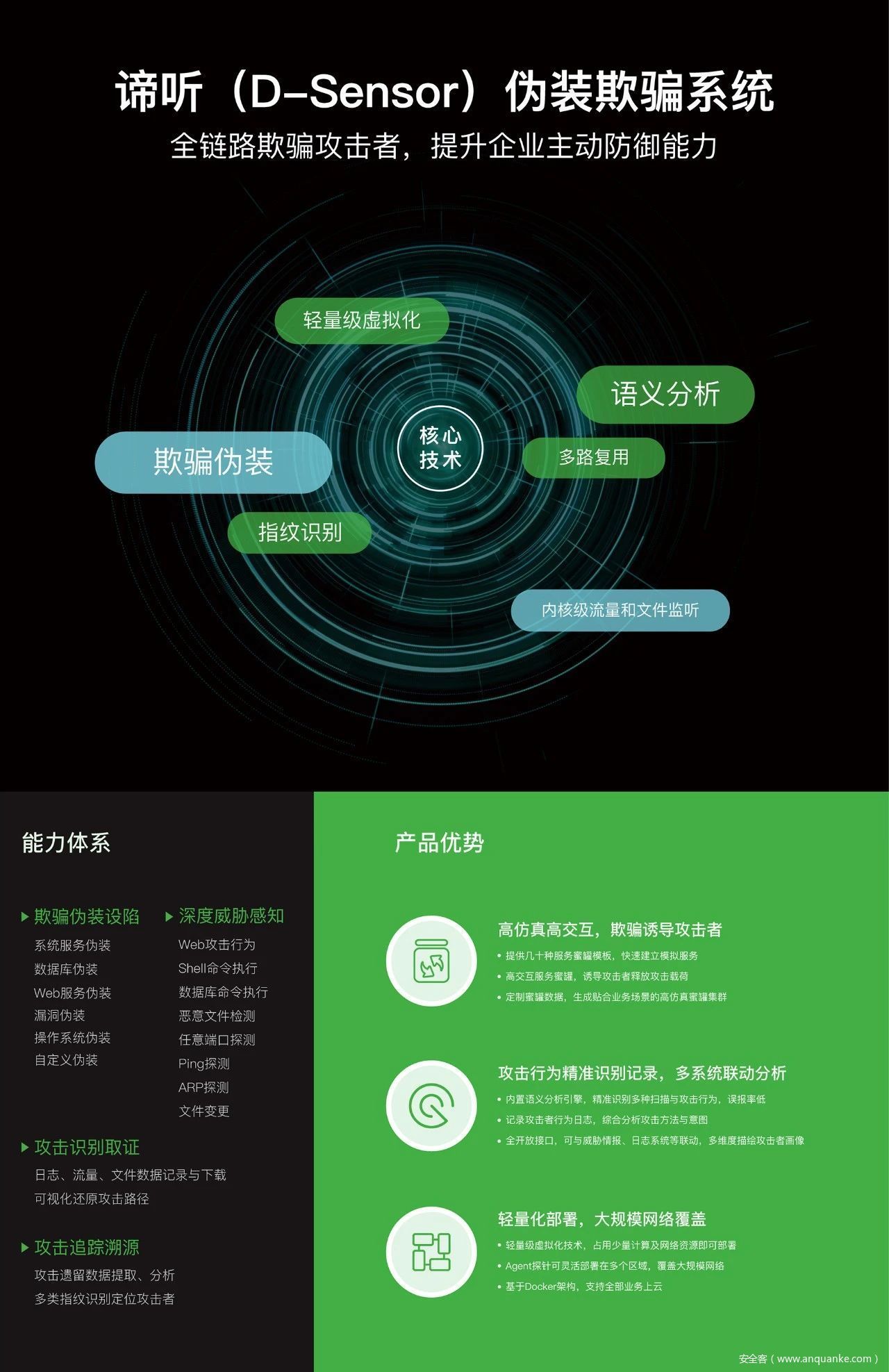 谛听(D-Sensor)伪装欺骗系统基于欺骗伪装技术,通过在攻击者入侵的关键路径上部署诱饵和陷阱,诱导攻击者进入与真实网络隔离的蜜网,让攻击者在蜜网中攻击“假”目标、获取虚假数据。 在此过程中,谛听(D-Sensor)能完整记录攻击者行为,捕获高级未知攻击,并且可以对攻击者做追踪溯源,为防守方提供先人一步的主动防御手段,保护真实资产,提升主动防御能力。
