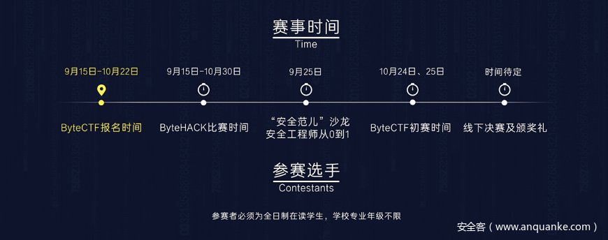 10月24日、25日ByteCTF线上初赛打响,初赛积分前20名的战队可进入决赛,争夺22万元现金奖励及20+字节跳动实习offer。