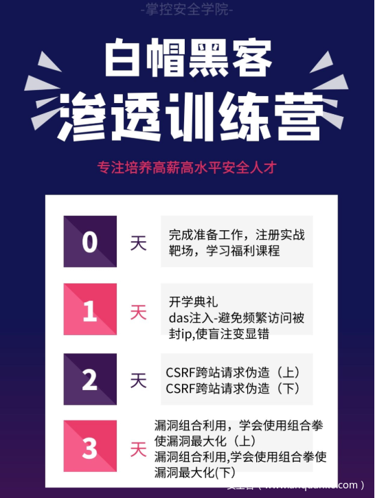 A:3天训练营货真价实只要2分钱哈!【掌控安全学院】是腾讯课堂官方认证的安全学院,已累计培养数千名安全人才,绝对官方可靠呦!