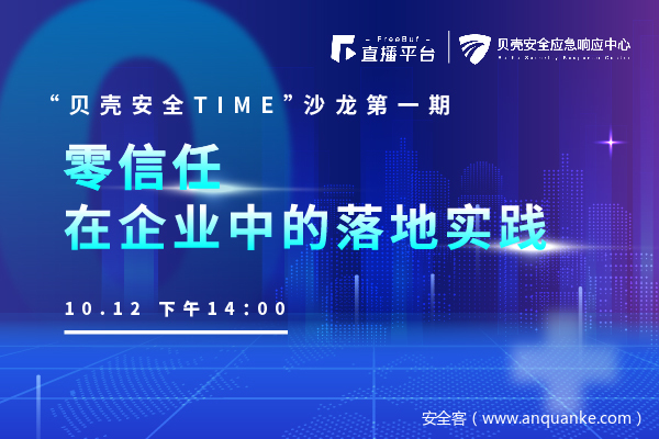10月12日14:00,「贝壳安全TIME」沙龙第一期线上直播,你想了解的零信任话题,在这里都能得到答案!深度解剖零信任技术应用细节,从甲乙双方企业中解析零信任不同的痛点。让安全问题不再成为用户向数字化转型的障碍,而变成转型的推进器。