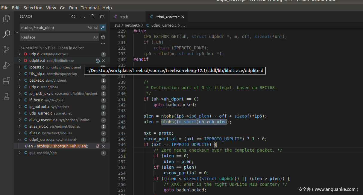 笔者分析了这个根因之后,也试图直接再在FreeBSD的源码中搜索采用两种方式索引UDP尾部的代码,期望能够找到类似的漏洞。经过搜索共发现了15个文件中34处出现通过UDP header索引的方式的代码。