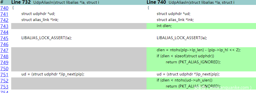 这个漏洞出现在FreeBSD内核的libalias库中,这个库的主要作用是对IP包进行aliasing和dealiasing,以实现NAT功能,同时libalias库还实现了一些和协议转换相关的功能。具体包含漏洞的源码为