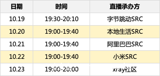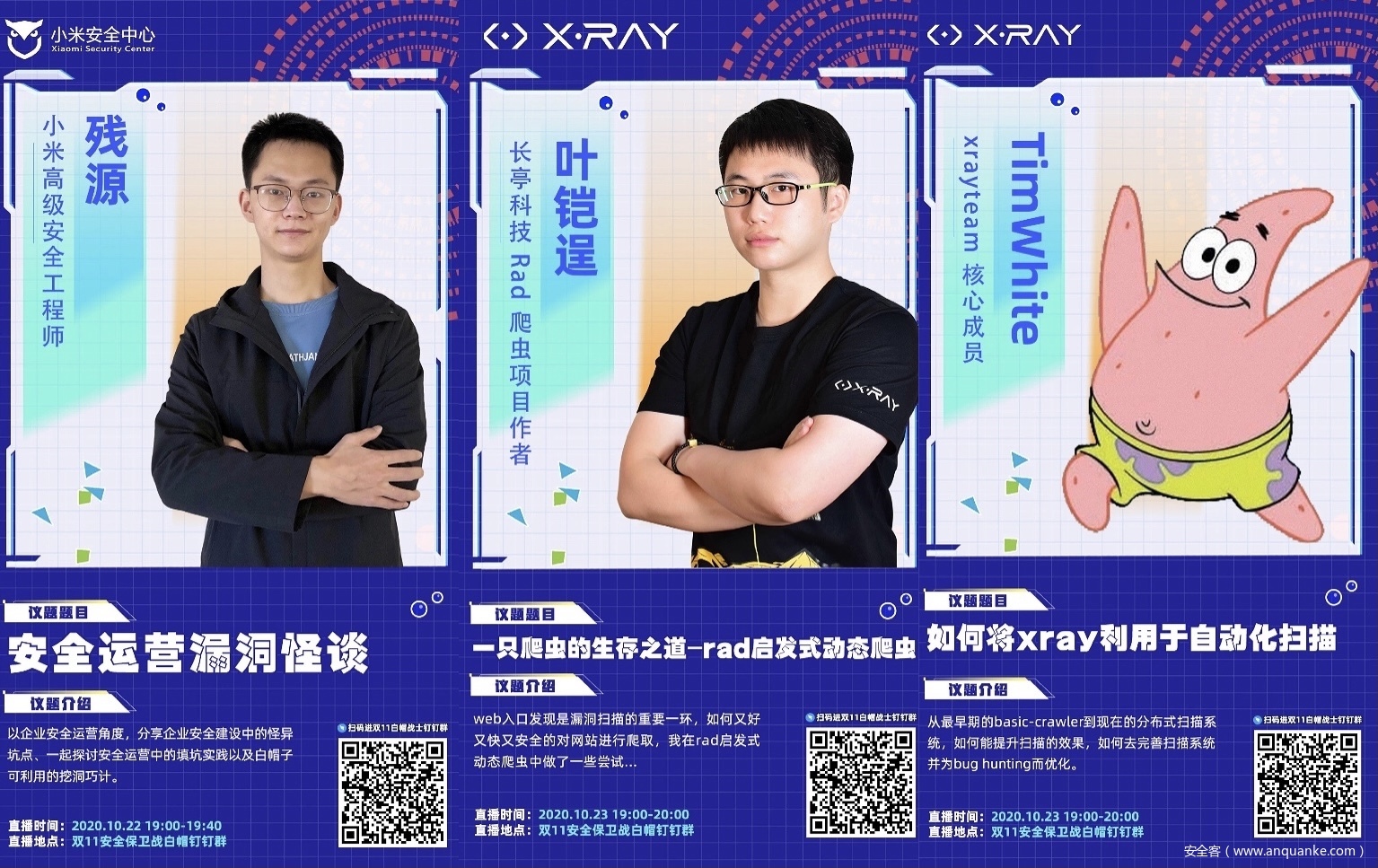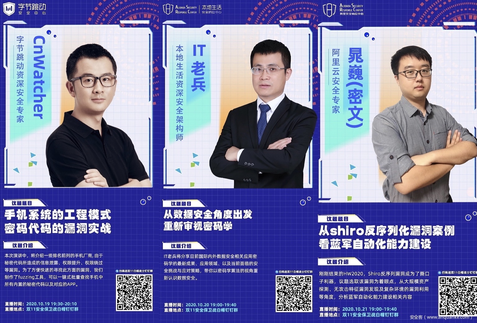10.19-10.23,连续5天,5场白帽兵法技术直播,直播可以在双11白帽战士钉钉群中观看回放,议题的详情PPT也会分享到群中,同时准备了技术书籍等多款诚意礼物。