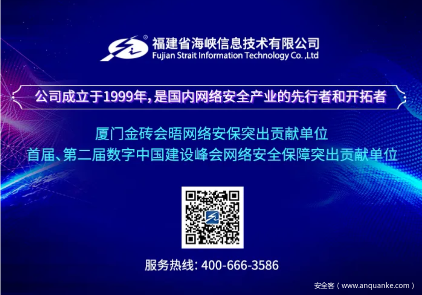 在历次重大活动的网络安保工作中,海峡信息凭借旗下黑盾安全产品,专业的安全服务,牢筑网络安全防线。没有网络安全就没有国家安全,海峡信息将不忘初心,砥砺前行,为成为国内领先的网络空间安全标杆企业的长远发展愿景而不懈努力!把守护国家信息安全这份重任与使命永远承载下去。让信息化更好造福社会造福人民!