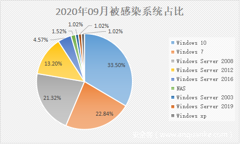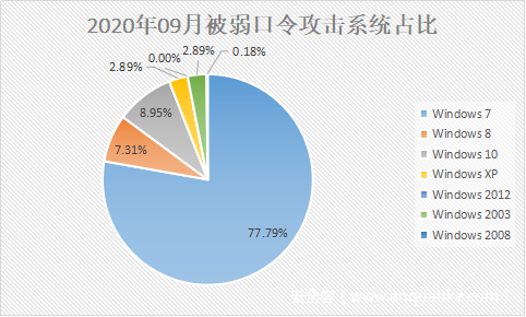 在弱口令攻击态势方面,9月各个被弱口令攻击的系统占比与8月相比,变化均不大,位居前三的系统仍是Windows 7、Windows 10和Windows 8。
