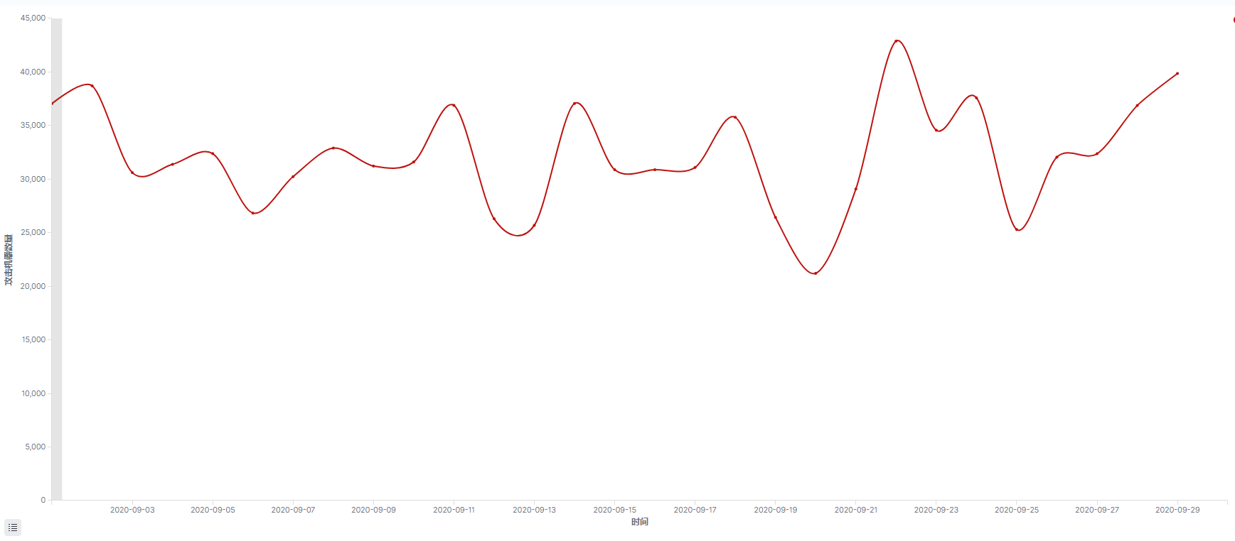 而在9月出现的弱口令攻击中,RDP和MySQL弱口令攻击的攻击态势整体无较大波动,但MSSQL弱口令攻击的攻击态势却出现一次上涨。