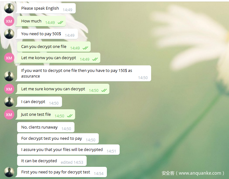 还有部分骗子,在中招用户提出需要测试解密文件时,会向用户索要150美元的保证金。但事实上,真的黑客为了赚取后续大笔的赎金,大多是会免费提供解密测试机会以展示解密能力的。