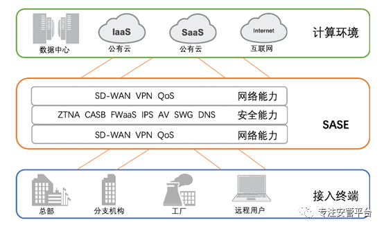 事实上,针对远程网络访问,有多种技术手段可供选择,包括VPN、ZTNA、CASB、VDI、远程浏览器隔离、反向代理、CDN,等等。它们之间不是简单的替代关系,而是各有用途及适合的使用场景。Gartner在该项目中优先推荐采用零信任理念和零信任网络访问(ZTNA)技术,从而间接使得该项目变成了一个ZTNA项目。Gartner针对本项目推介的样本厂商都是ZTNA厂商,并且主要是基于云的ZTNA厂商。Gartner对零信任的定义参考了《NIST SP800-207零信任架构》中的定义,并提出了“零信任网络”的概念。Gartner认为,零信任是一种安全范式,它根据情境信息(主要是身份信息)持续评估显式的风险及信任级别,替代原有的隐式信任机制,以适应组织安全形势的风险优化。同时,Gartner认为零信任网络由建立在资产管理和访问管理基础上的三个支柱构成,这三个支柱分别是ZTNA、网络访问控制(NAC)和基于身份的隔离(即之前所称的微隔离)。Gartner将零信任网络访问(ZTNA)定义为一类产品和服务。这些产品和服务创建了基于身份和情境的逻辑访问边界,涵盖用户、一个应用或一组应用程序。这些应用程序(在获得授权之前)被隐藏起来从而无法被发现,只能严格通过信任代理来建立连接和实现访问。代理在允许主体访问之前先验证其身份、情境和策略遵从情况(即先验证再访问),并最小化该主体在网络中向其他位置横向移动的可能性。在Gartner看来,ZTNA未来将成为SASE战略的一部分,与CASB等安全技术一道被SD-WAN封装到边缘计算的安全能力集合中。在Sec-UN上的《无SD-WAN不SASE》一文有一幅形象的图展示了SASE的部署架构,如下所示:5.2 基于风险的弱点管理项目