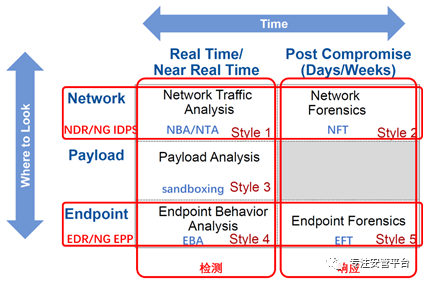 如前所述,XDR可以看作是多种检测与响应技术的集成,作为一个统一的、全面的检测与响应平台。对XDR而言,不是要研究新的检测与响应技术,而更多是考虑如何将不同的检测与响应技术整合到一起。因此,为了了解XDR未来的发展趋势,必须先了解当下都有哪些检测与响应技术。当Gartner研究和讨论检测与响应类技术的时候,涉及的技术面和细分市场是相当广泛的,需要多个不同的Gartner安全分析师团队之间的合作,而一年一度的Hype Cycle(炒作曲线)则是各个分析师协作的一个成果体现。目前,检测和响应相关的技术大都收录在“安全运营”炒作曲线中。“安全运营”这两个炒作曲线分类是2020年新提出来的,之前叫“面向威胁”,始于2017年,在2016年及以前叫“基础设施保护”。下图是2020年的“安全运营”技术炒作曲线,里面基本涵盖了Gartner涉及的所有检测与响应类技术。上图虽然列举了大量检测与响应技术,却并没有对他们进行分类。而对检测与响应技术进行分类是一个重要但十分困难的事情,Gartner自己也做过多种尝试,目前尚无定论。Gartner在2013年为了讨论高级威胁检测(ATD)的时候提出了一个划分新型检测技术的方法论,虽在2016年后逐渐淡出Gartner报告的视野,但却依然有一定价值。如下图所示,Gartner当时从分析对象和分析时间两个维度划分了五种新型检测技术:针对这幅图,笔者结合自己的认识,对当下主流的几种新型检测技术进行了标注如下:可以看到,NTA是当下主流的基于网络的新型检测技术,NFT(网络取证工具)作为基于网络的响应技术比较少被提及。从2020年开始,Gartner正式将NTA改名为NDR(网络检测与响应)。注意,上图只对D进行了划分,没有提及R。因此,NDR不仅包括NTA,NFT,还要包括响应能力。对应NDR,现在还有一个初现的提法,叫NGIDS,或者NG IDPS,所谓下一代入侵检测,但这些提法缺乏对R的体现。从基于端点的视角来看,style4和style5两种技术现在已经不再加以区分,统称为EDR,或者作为下一代EPP的关键能力之一了。上图中位于中间的基于负载的检测技术,基本就是指代沙箱技术了。而该技术事实上还可以分解到基于端点的沙箱和基于网络的沙箱两个维度中去,成为更广泛意义上的NDR和EDR的功能点之一。上图对于阐释当下最热门的两种新型检测与响应技术——NDR和EDR——及其市场演进是有价值的,但却远远无法表达完整意义上的检测与响应技术,更何况检测与响应技术本身也仅仅检测与响应体系建设的一环而已。2018年,Gartner在一份名为《如何开展威胁检测与响应实践》的报告中给出了一个基本的检测与响应体系的参考模型,如下图:上图比较全面地表达了检测与响应体系所应涵盖的技术(能力)、流程和团队三个方面的内容,给出了10个技术能力和4个关键流程,并沿用至今。这10个技术能力从目标对象和时间先后两个维度进行了划分,与前面的新型威胁检测二维划分方式基本一致。不同之处在于目标对象粒度更细,最关键地是加入了针对日志的检测与响应,并把SIEM和CLM(集中日志管理)作为最基本的检测与响应的平台,位置要高于后面4个。此外,在这个10大技术能力矩阵图中,响应能力从技术视角来看被称作了“可见性”,所谓可见性就是在威胁猎捕和安全响应(包括调查、取证)的时候能够提供相关的技术支撑。检测与响应能力从流程视角对应了4个方面,它们从技术上可以由SOAR来提供支撑。事实上,即便是上面的10+4检测与响应参考架构图都没能将检测与响应技术描绘全,譬如基于用户/实体进行检测的UEBA技术,以及欺骗技术。Gartner自己也表示上图仅仅是针对基本的检测与响应能力进行阐释。在2020年的炒作曲线中,UEBA已经去掉了,Gartner表示它已经成为了其它技术的组成部分,主要是融入了SIEM,而XDR、EDR和NDR也都会用到。Gartner将欺骗技术单独作为一个技术分支,与面向日志的检测与响应技术、面向网络的检测与响应技术和面向端点的检测与响应技术并称为四大检测与响应技术路线。对于SIEM而言,欺骗平台的告警可以成为一个高置信度的数据源。BAS(破坏与攻击模拟)也是一种检测与响应技术,可以为SIEM提供重要的基于验证的检测与响应能力补充。5.3.7.2 XDR发展趋势分析