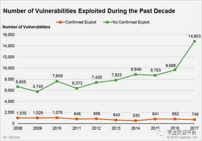 必须注意,弱点管理不是弱点评估。弱点评估对应我们熟知的弱点扫描工具,包括系统漏扫、web漏扫、配置核查、代码扫描等。而弱点管理是在弱点评估工具之上,收集这些工具所产生的各类弱点数据,进行集中整理分析,并辅以情境数据(譬如资产、威胁、情报等),进行风险评估,按照风险优先级处置弱点(打补丁、缓解、转移、接受,等),从而帮助安全管理人员进行弱点全生命周期管理的平台。记住,弱点管理是平台,而弱点扫描是工具。Gartner表示,基于风险的弱点管理是一个不断迭代提升的过程,包括弱点评估、弱点处置优先级排序、弱点补偿控制三个阶段,如下图所示:上图针对每个阶段列举了可以用到的技术。譬如动态应用安全测试(DAST)、云安全配置评估(CSPA)、破坏与攻击模拟(BAS)、弱点优先级划分技术(VPT,取代之前的TVM)、应用弱点关联(AVC)、安全编排自动化与响应(SOAR)。而基于风险的弱点管理的核心是弱点处置优先级确定。可以采用多种方式去确定这个优先级,但最关键的一点是:聚焦在可被利用的漏洞上。下图是Gartner引述IBM X-Force的一个统计图。可以看到,历史上可被利用的漏洞占爆出的漏洞的比重还是很低的。下面这个老图也很有说服力。这个图表明用户首先需要关注的是那些实际存在于你的网络环境中的可被利用的漏洞。现实已经表明,漏洞太多了,层出不穷,如果每个重要的(譬如依据CVSS)漏洞都要去处理,是不现实的,应该首先聚焦在可被利用的漏洞上。进一步讲,你如何知道一个漏洞是否已经可被利用?这时候就需要漏洞情报,不是关于漏洞自身的情况,而是关于漏洞利用(EXP)和漏洞证明(POC)的情报。在基于风险的弱点管理方法论中,补偿阶段也很重要。最关键的是要意识打补丁(Patch)仅仅是N分之一个选择项,你还有大量手段可以用。事实上,大量的业务系统留给你足的够时间直接打补丁的机会并不大。这里,笔者对于如何在补丁管理这个事情上取得与IT运维的双赢也有一些建议:安全运营在弱点管理的时候要给到IT运维足够的信息和建议去指导他/她打补丁,而不仅仅是一个告警/工单或者甩过去一个补丁包。这时候Gartner的那句话再次回响:Remember your organization decides whether to take on therisk; our job in security is to provide all known data points to support abusiness decision. 谨记,要让漏洞管理闭环,需要安全运营与IT运营共同协作,需要业务部门的参与。作为安全运营,要把自己的工作做好,做到有价值。5.3 平台方式的检测与响应(XDR)项目