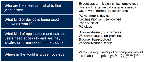 很显然,突如其来的疫情使得员工远程办公迅速扩张,如何保障员工安全地,并且尽可能体验友好地访问企业网络和应用成为了十分急迫的议题。企业和组织的管理者必须制定一个全面的远程办公策略,并且和业务部门进行良好的沟通。如何制定策略?首先就要做好需求收集与分析。Gartner提议重点关注4个问题: