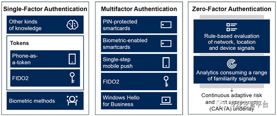 首先,笔者这里将password翻译为口令,而不是密码!二者不是一回事儿。用户对各种系统的口令管理一直是个令人头痛的问题,大家通常都不乐意定期修改口令。对企业和组织而言,在网络环境中实现无口令认证机制无疑会在提升企业安全的同时极大地提升用户体验。要实现无口令认证,有多种技术选项,如下图所示,包括单因素认证、多因素认证和无因素认证,要根据不用的场景来取舍。Gartner提醒大家,受限于企业现有系统的复杂性,要实现通用简洁的无口令认证机制并非易事,IAM项目团队需要一套跨多种场景的整合策略。首先,当前的无口令认证技术差异巨大,有的是在用户交互层消除了口令,但底层本质还是基于口令认证的;还有的则是在底层上就消除了口令。Gartner推荐部署了Windows系统的企业和组织优先评估微软的Hello解决方案,以及手机即令牌(phone-as-a-token)的多因素认证解决方案。其次,寻找一个适用于不用应用场景的、兼容现有网络和系统架构的整合性无口令认证解决方案。在无法实现完全无口令认证(如某些登录过程)的时候,可以退而采用“轻口令”方式。5.8 数据分类与保护项目