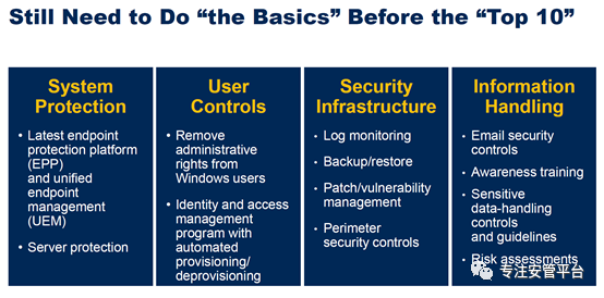 一如既往地,Gartner特别强调,客户在考虑上马10大项目之前,一定要考虑到先期的基础安全建设,这些项目都需要建构在基础安全能力达标的情况下。这些基础安全能力包括(但不限于):