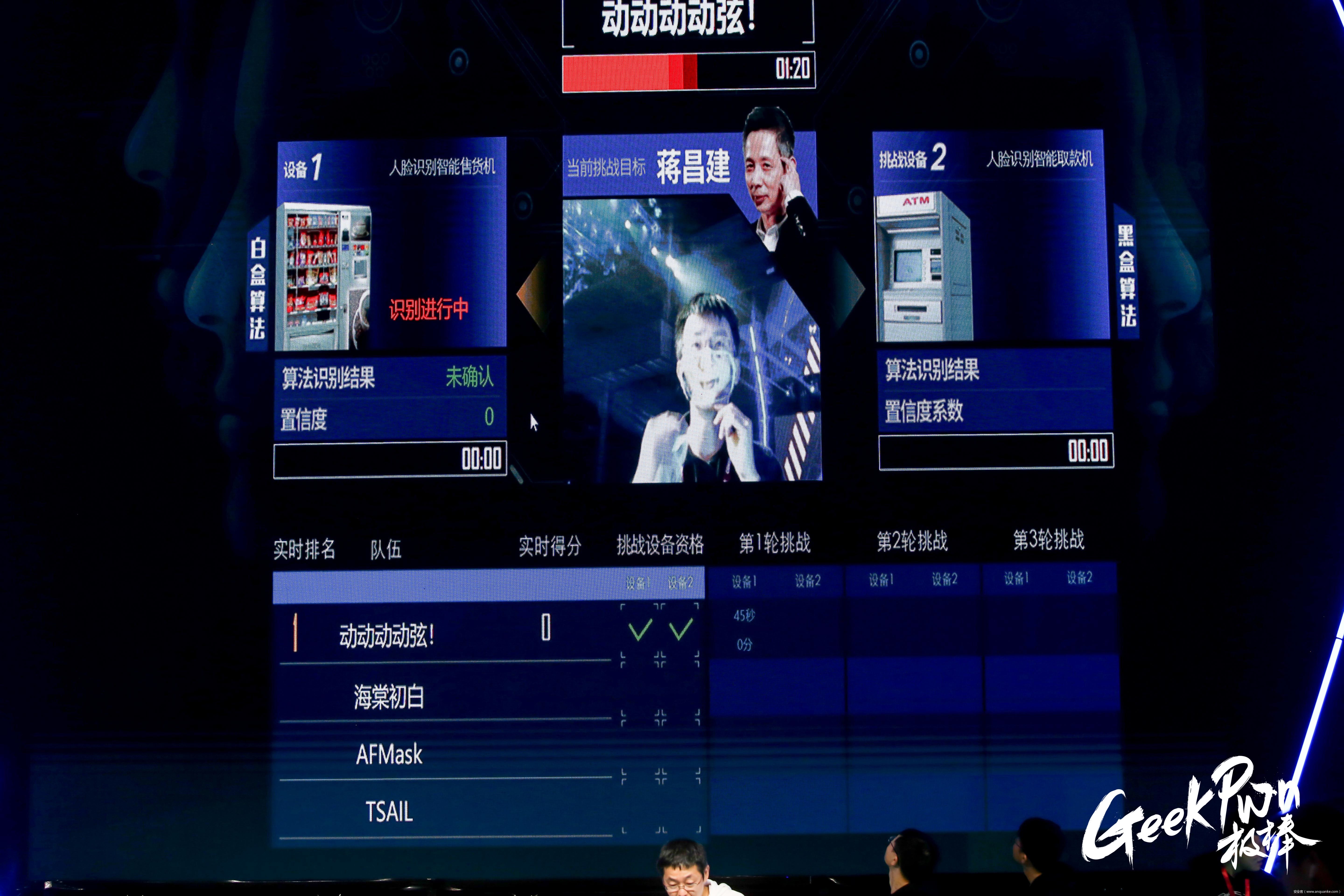 CAAD AI变脸口罩挑战赛现场,来自清华大学计算机系和瑞莱智慧公司TSAIL、由清华大学和北京大学师生组成的动动动动弦、海棠初白、AFMask战队的选手们都戴上了有AI生成图像的口罩,选手们利用算法缺陷欺骗人脸识别算法,分别对人脸识别的售货机和ATM机进行白盒与黑盒攻击。最终,AFMask战队自制的口罩实现伪装、在30秒内成功欺骗人脸识别,识别率都超过0.5,项目挑战成功。受现场灯光、网络等因素的干扰,下午,比赛在场下进行了精彩角逐。最终动动动动弦战队以3783分成功问鼎;海棠初白战队以3754分获得第二名,AFMASK战队与TSALL战队以2224分与1185位列第三与第四名。