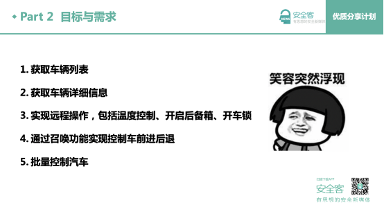该部分讲述制定要分析的内容与要实现的功能。主要分析和实现的内容有:获取车辆列表与详细信息、实现远程控制解锁等功能、实现远程遥控汽车,同时这些操作可以实现批量控制。