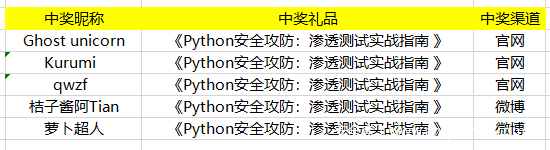 恭喜以下小伙伴获得《Python安全攻防:渗透测试实战指南 》 一本,官网中奖的小伙伴赶紧进入安全客用户交流5群:1015601496,联系群主@安全客发送收货地址吧~微博中奖的小伙伴记得在微博填写地址哦~