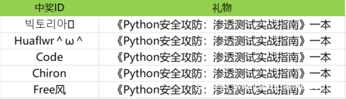 获奖方式3:参与微信公众号文末评论活动,抽5名用户赠送《Python安全攻防:渗透测试实战指南 》 !