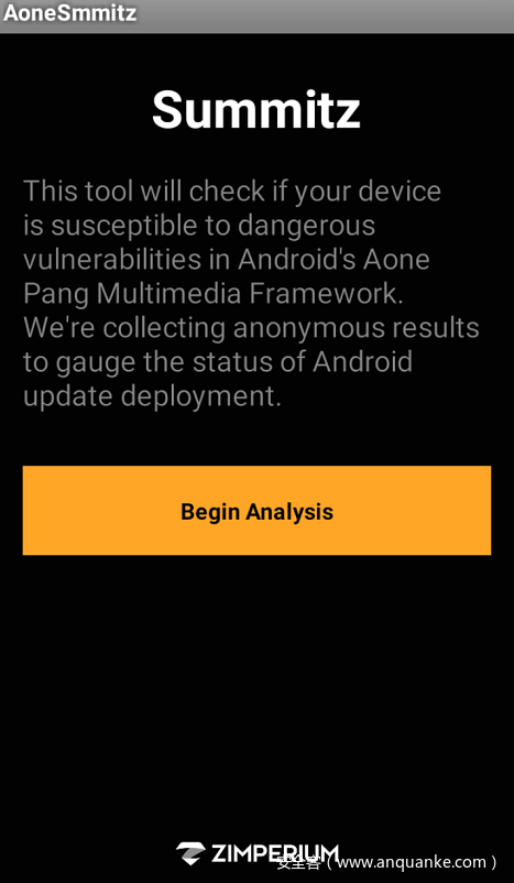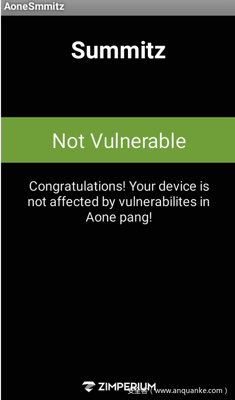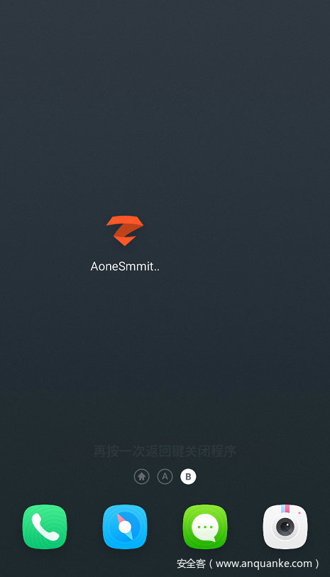 仿冒安全软件AoneSmmitz诱导用户安装,当用户打开软件,提示用户这个工具是检测用户设备有没有漏洞的工具,当用户点击开始检测,返回用户的是您的设备无安全漏洞。从功能上仿冒安全软件,让用户放松警惕。