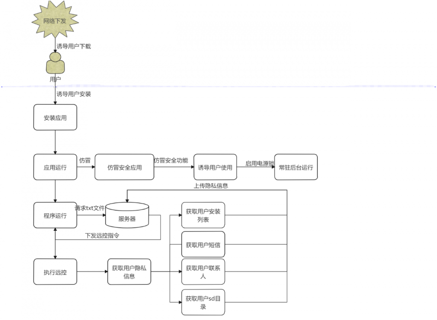 仿冒安全软件,诱导用户下载安装,用户安装后,仿冒安全功能诱导用户使用,开启电源锁常驻后台运行,向服务器请求远控指令,执行远控指令,获取用户短信、联系人、应用安装列表、sd卡文件名称等信息,将获取的隐私信息上传到服务器。