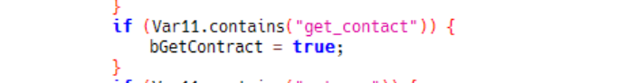 3)解析远控文件当中的远控指令,当指令是get_contact,将bGetContract的值设置为true,当bGetContract的值为true时,获取用户联系人数据。