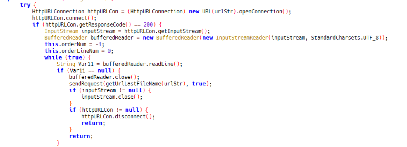 恶意程序向服务器请求远控文件之后获取远控文件,恶意程序根据远控文件当中的内容来区分远控指令。获取用户通讯录、获取用户短信、获取外部存储器文件目录、获取已安装应用列表数据等隐私数据。将获取的用户隐私信息上传到指定服务器。