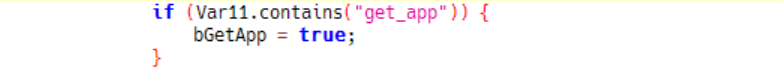 5)解析远控文件当中的远控指令,当指令是get_app,将bGetApp的值设置为true,当bGetApp的值为true时,获取用户安装的应用程序信息。