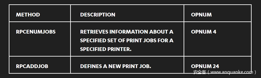 - OpNum可以确认针对接口调用的函数(即创建和删除打印作业)。