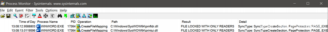 实际上,查找异常作业的一种方法是过滤掉通过UI调度的作业。为此,我们可以打开SysInternals Process Monitor,并在Microsoft Word中执行一个交互式打印,这时,我们就会发现prntflr.dll将再次被加载,而另一个同时加载的DLL却变成了printui.dll。