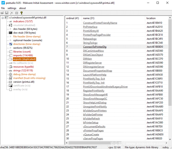 虽然通过名称就能猜出这个DLL的用途,但是为了严谨起见,我们还是查看了这个系统DLL的导出函数(在本例中我们使用的是pestudio)。其中,其中有一个名为“connecttoprintdlg”的函数,通过查阅Microsoft文档,我们了解到该函数的用途是“显示对话框,以允许用户通过该对话框来浏览并连接到网络上的打印机”。