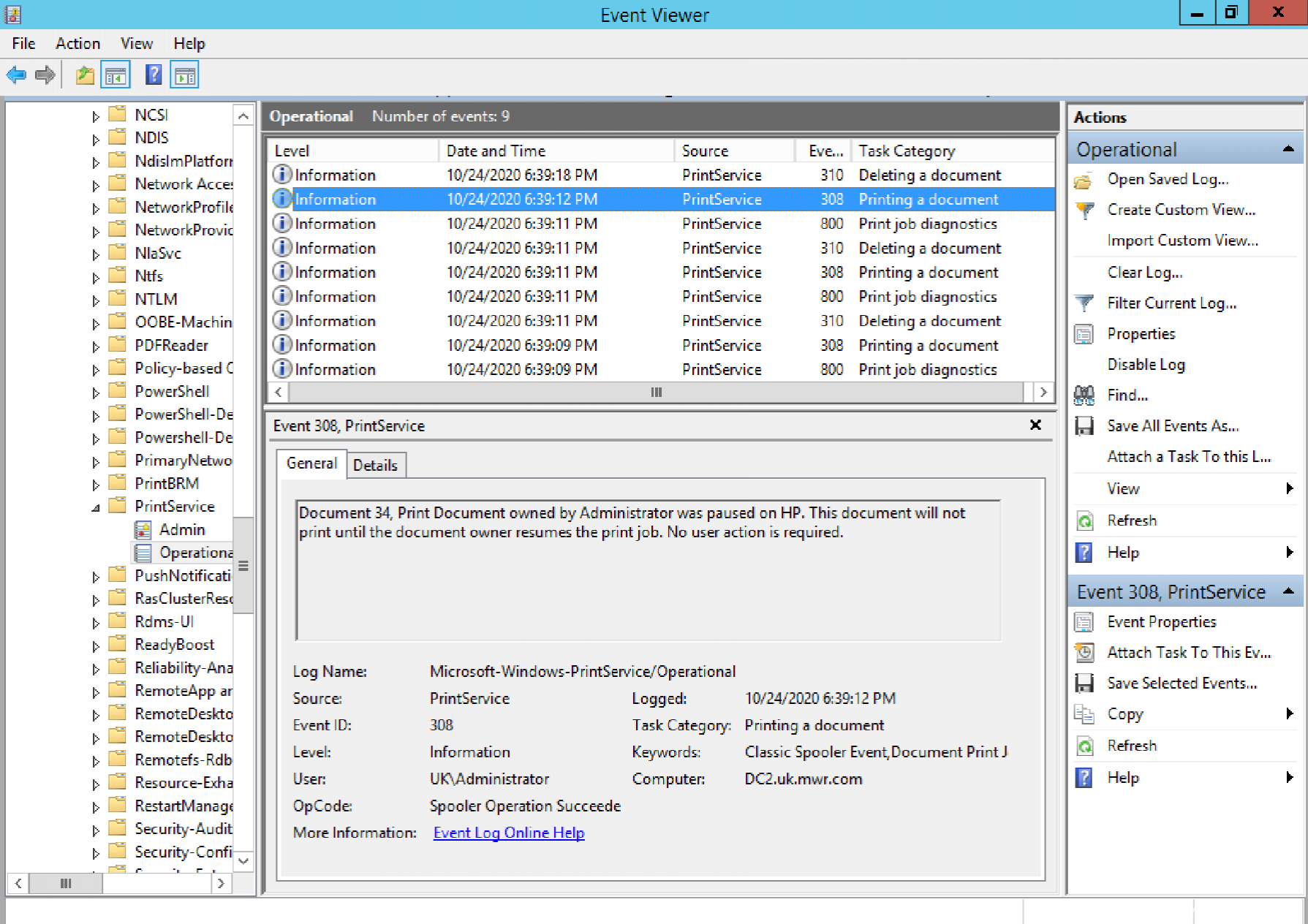 此外,观察上面的屏幕截图中的日志模式,我们可以看到EID 800(假脱机)、308(打印)和310(作业删除)的组合。这里至关重要的是,通过下面的截图我们可以看到EID 308事件,这表明我们的每一个作业都被设置为暂停状态。因此,两个relay之间的连续通信会产生大量的暂停打印作业和删除作业。