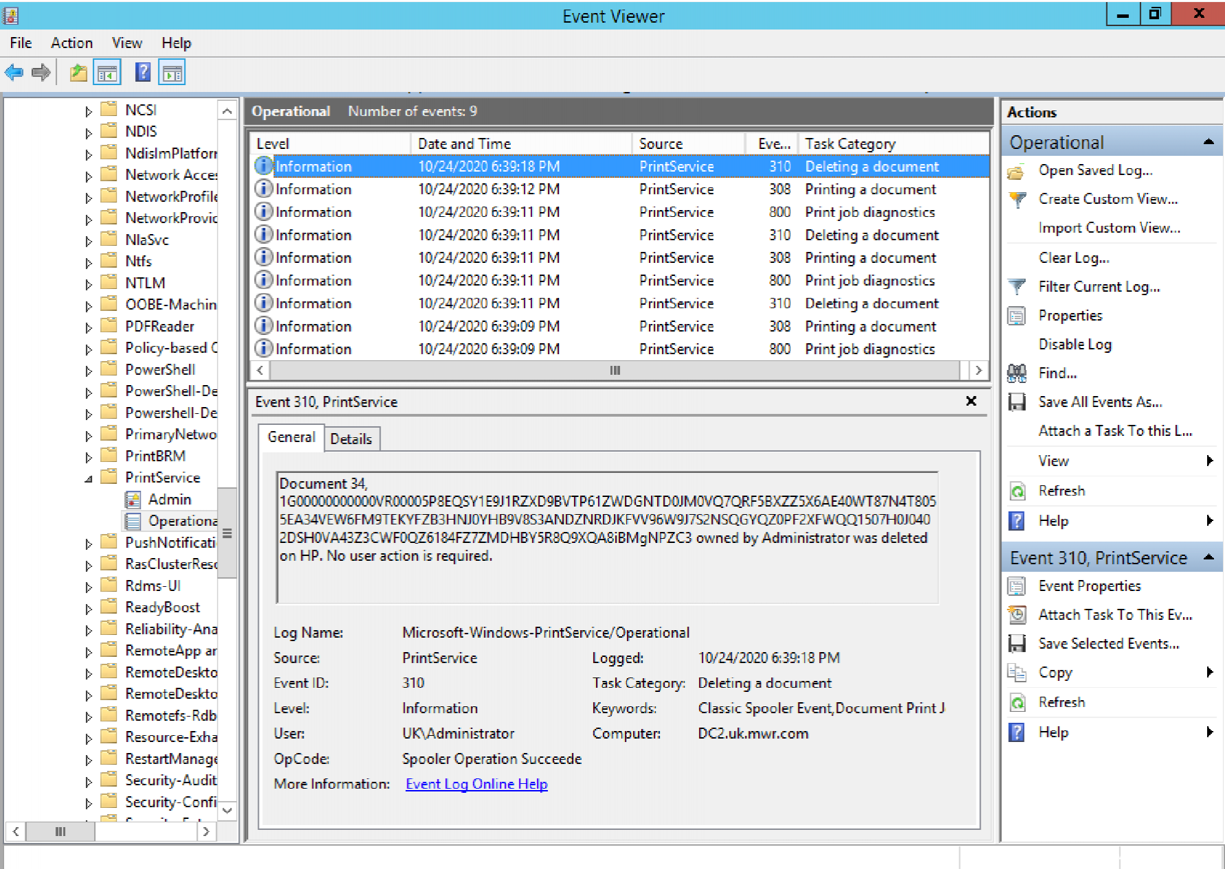 最后,在打印服务器本身上面,我们可以使用“Microsoft-Windows-PrintService/Operational”日志来跟踪打印作业。为此,我们可以通过组策略以及以下命令来启用该日志: