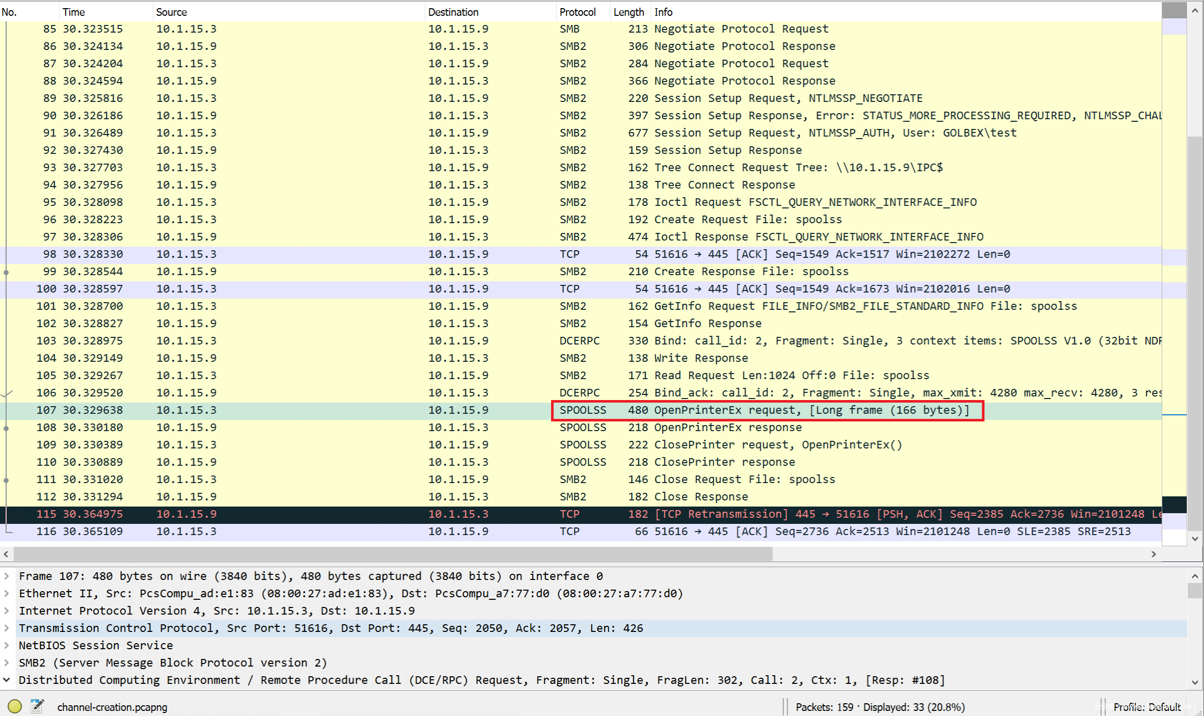 如上文MS-RPRN规范中所述,我们对远程服务器的RPC调用是通过SMB进行的。从捕获的通信数据包中,我们可以看到与打印服务器的连接,特别是OpenPrinterEx 请求。