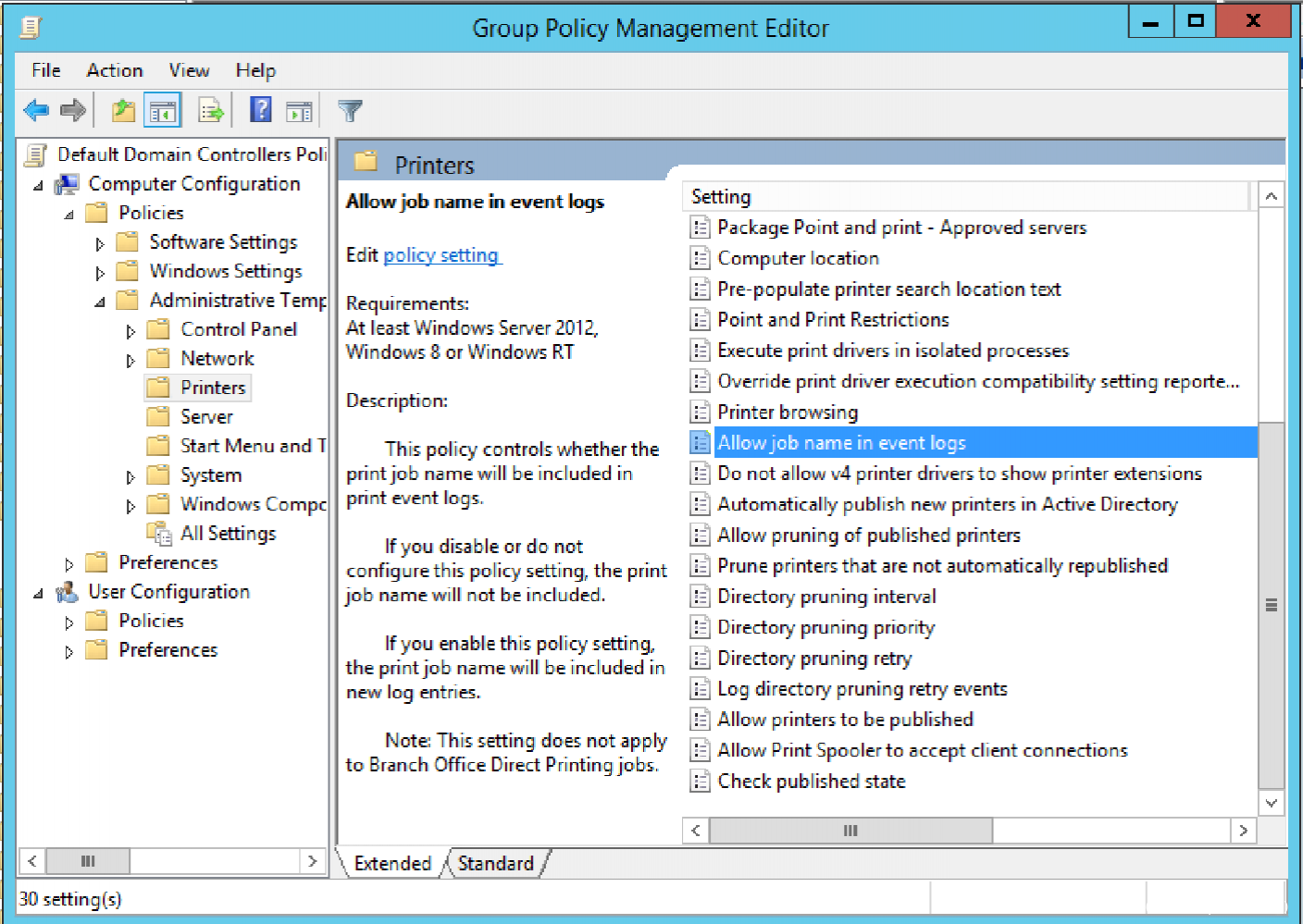 Computer Configuration > Policies > Administrative Templates > Printers > Allow job name in event logs
