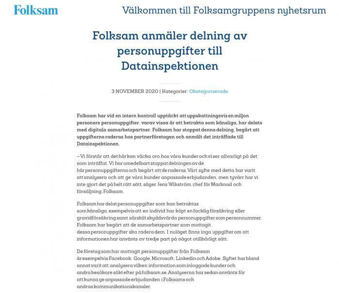 根据知情人士透露的最新消息,当地时间2020年11月03日,瑞典最大的保险公司Folksam经证实,已将其大约一百万瑞典公民的客户个人信息泄露给了Google和Facebook等多家社交媒体以及技术巨头。