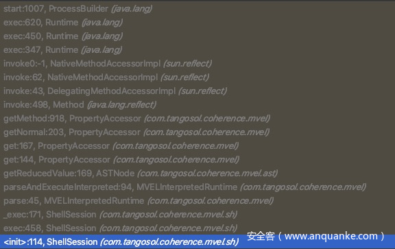 接下来就是一个gadgets的寻找问题了,什么类的构造函数调用后会造成rce的效果,目前公开的poc是coherence.jar中的类ShellSession,本文也就去分析一下这一条gadgets,看一下调用栈,