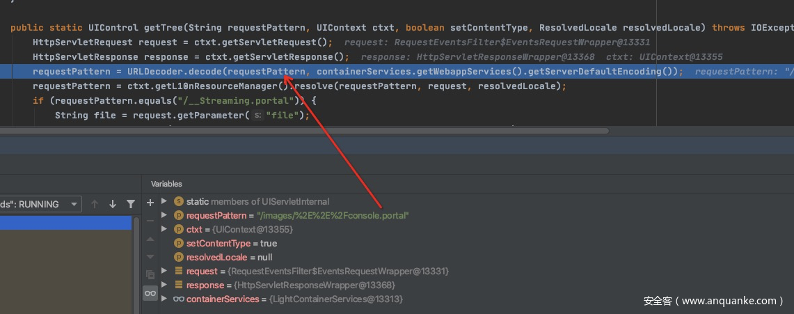接下来就是问题二,weblogic究竟在哪个位置进行了二次url编码,一次url编码肯定是正常的 ,这是每个中间件都会做的事情,那我们顺着这条调用栈继续往下跟进,这段代码位于UIServletInternal.getTree处,在这里应用对已经进行了一次url编码的URI进行了第二次url编码