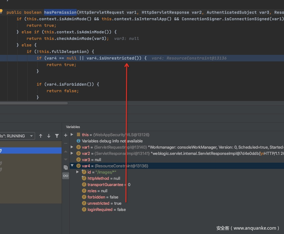 如果不包含,则进入CertSecurityModule.checkUserPerm,在这个函数中会检测配置常量protectResourceIfUnspecifiedConstraint的值(默认为false),如果是false就会进入WebAppSecurityWLS.hasPermission,查看是否有这个文件的访问权限,当然,资源文件的访问权限自然是有的,