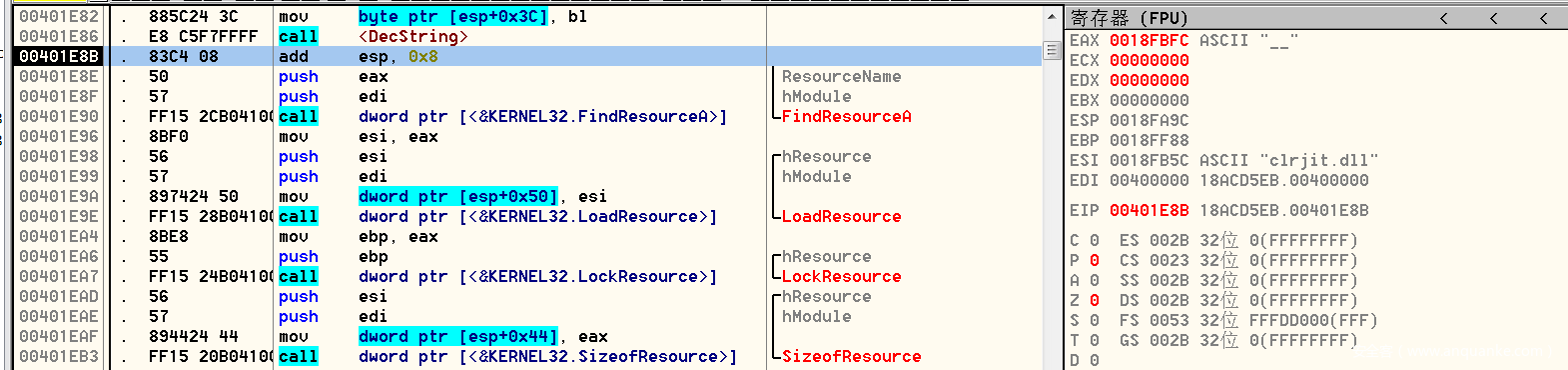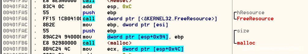 看看下面解密函数栈,第一个是刚刚malloc的空间,也就是解密数据要放的空间。第二个是之前malloc的大小。第三个是之前mallco空间的地址(加密的数据),最后一个是资源的大小。