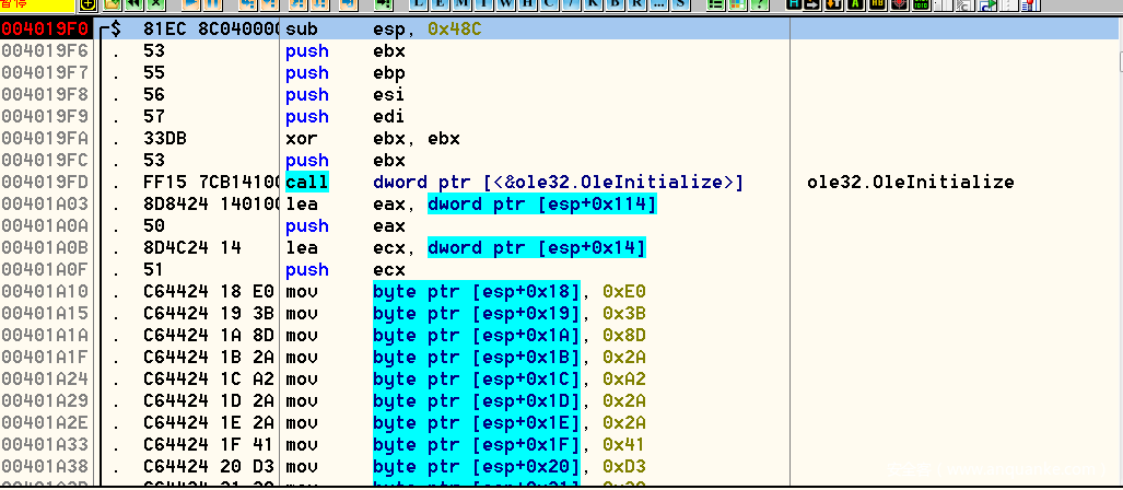 有了大体的认识之后我们可以开始用OD调试看看里面具体的细节,首先我们可以来到程序的入口点,不是VC的入口点,而是进入main函数里面的代码。发现调用了OleInitialize这个函数,这个函数的作用是初始化COM库。所以后面肯定使用到了COM库。