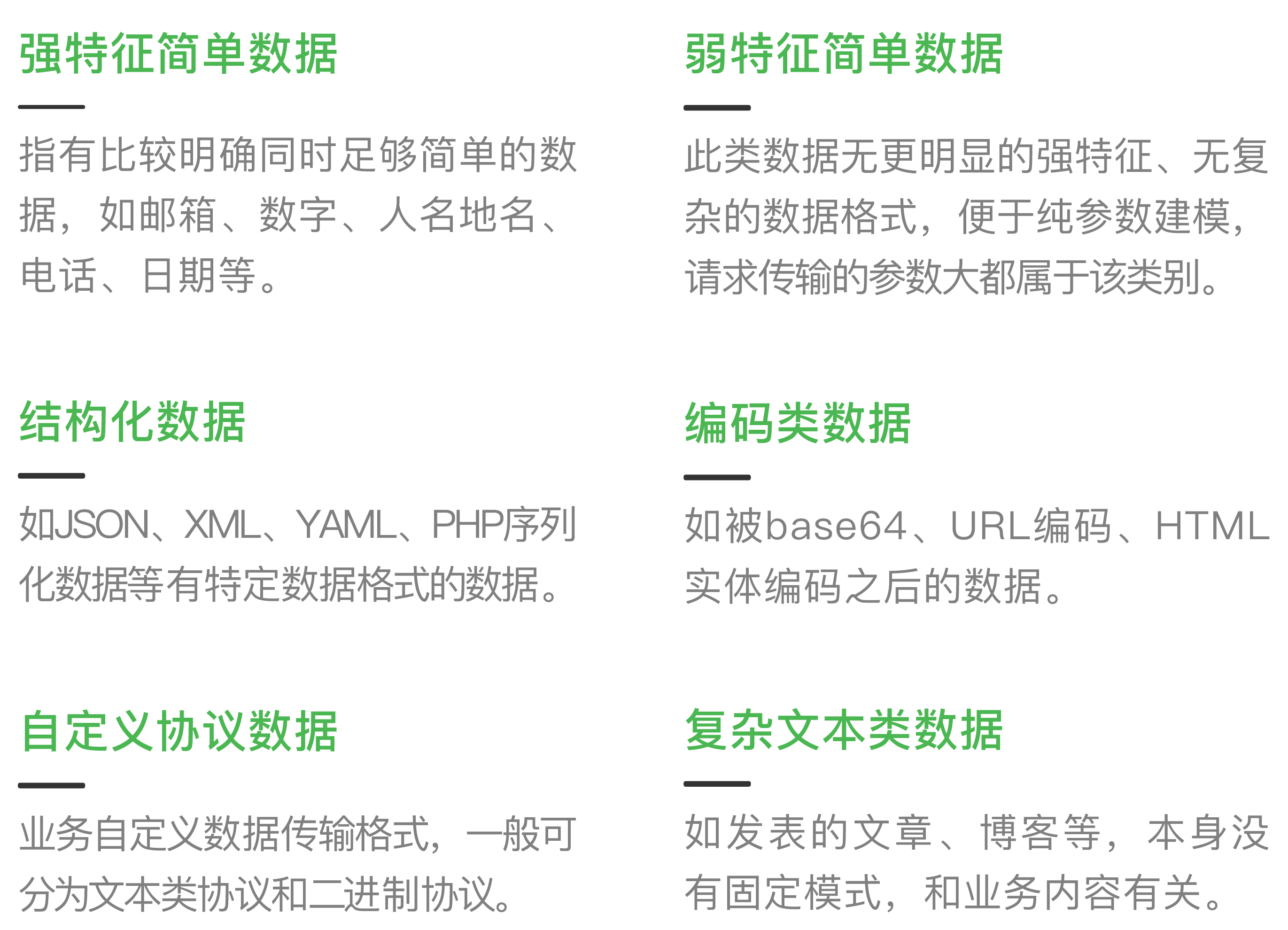 1.因内容没有明确的模式可寻,从内容和语义角度分析数据易出现误报。